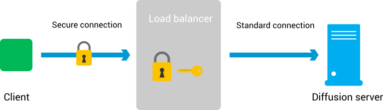 Diffusion™ clients can connect to your solution using Transport Layer Security (TLS) or Secure Sockets Layer (SSL) . The TLS / SSL can terminate at your load balancer or at your Diffusion server.