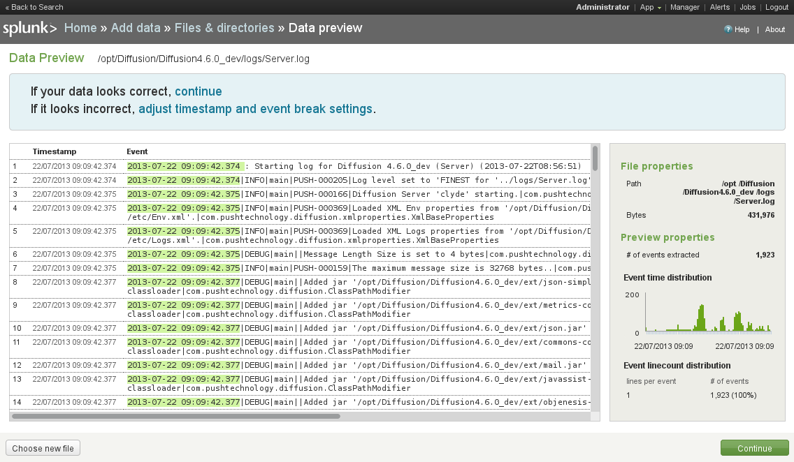 This is easier to do with existing log files to import, so configure Diffusion to write log files. To better demonstrate Splunk , set the server log file to TRACE logging in etc/Logs.xml and start Diffusion .