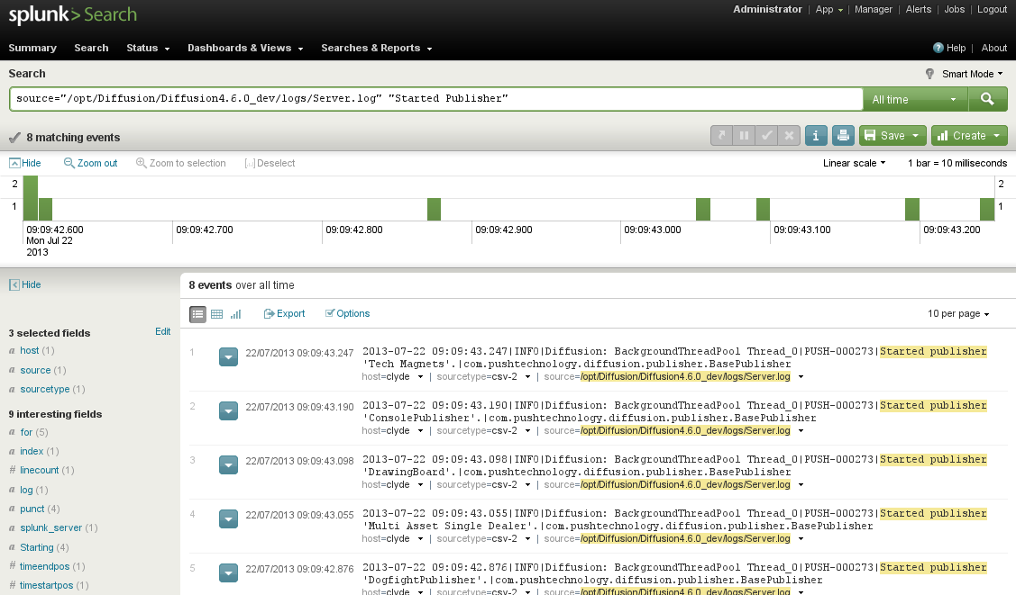 On the Splunk launch page, select the Search option. On the Search Summary page that opens, select the Source relating to the file logs/Server.log previously imported. The page changes to include the source in the Search area. Additional search terms can be added to the end, for example, "Started Publisher".