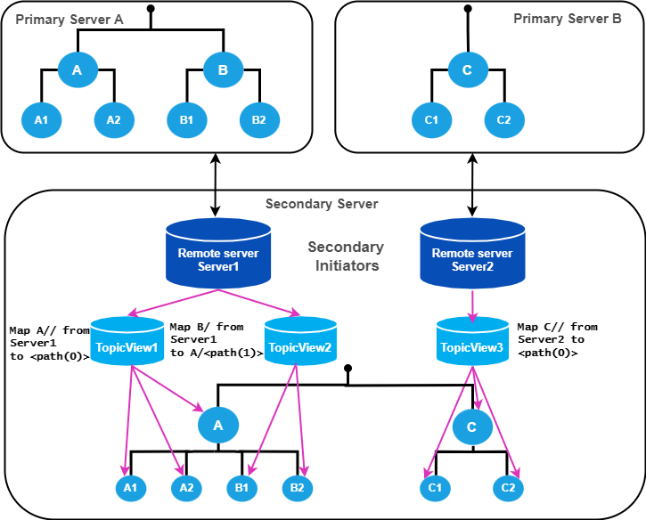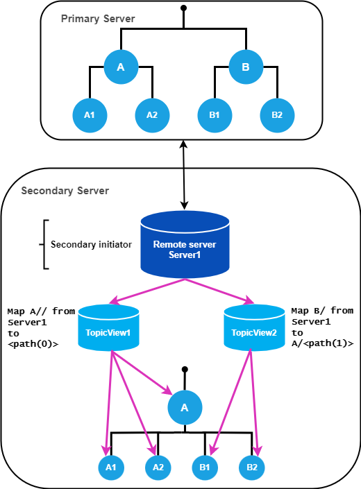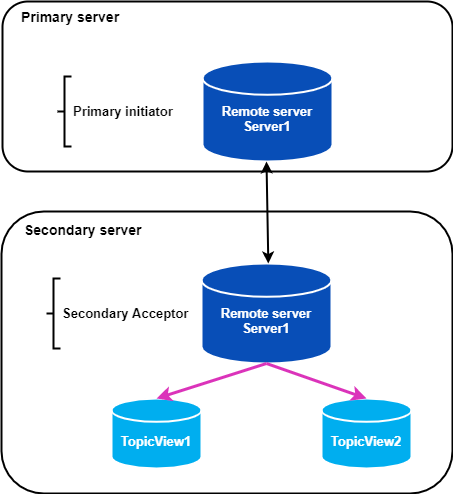 The server on which the topic view exists is referred to as a 'secondary server' and the server on which the source topics exist is referred to as a 'primary server'.
